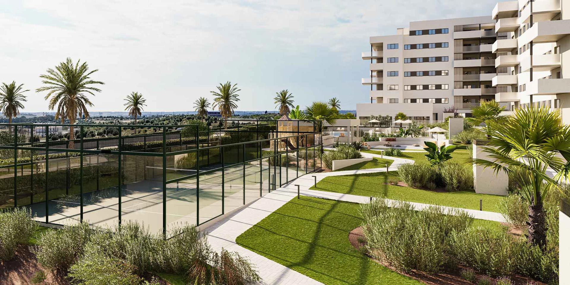 La promoción se compone de 128 viviendas distribuidas en cuatro bloques de planta baja más seis alturas, organizados en los linderos Sur, Este y Norte de la parcela. Esta disposición libera el lindero Oeste, permitiendo una zona comunitaria central abierta y bien orientada, que incluye amplias áreas verdes, piscina, pista de pádel y zona de juegos infantiles. Un sótano común conecta los cuatro bloques y alberga 165 plazas de aparcamiento, 128 trasteros y locales técnicos, con acceso rodado desde la calle Manuel Ríos Moreno y comunicación directa con los portales mediante ascensores y escaleras.